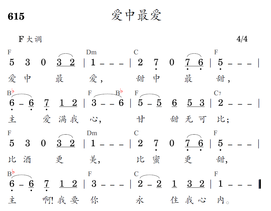 爱中最爱,甜中最甜,主爱满我心,甘甜无可比;比酒更美,比蜜更甜,主啊!我要你永住我心内。