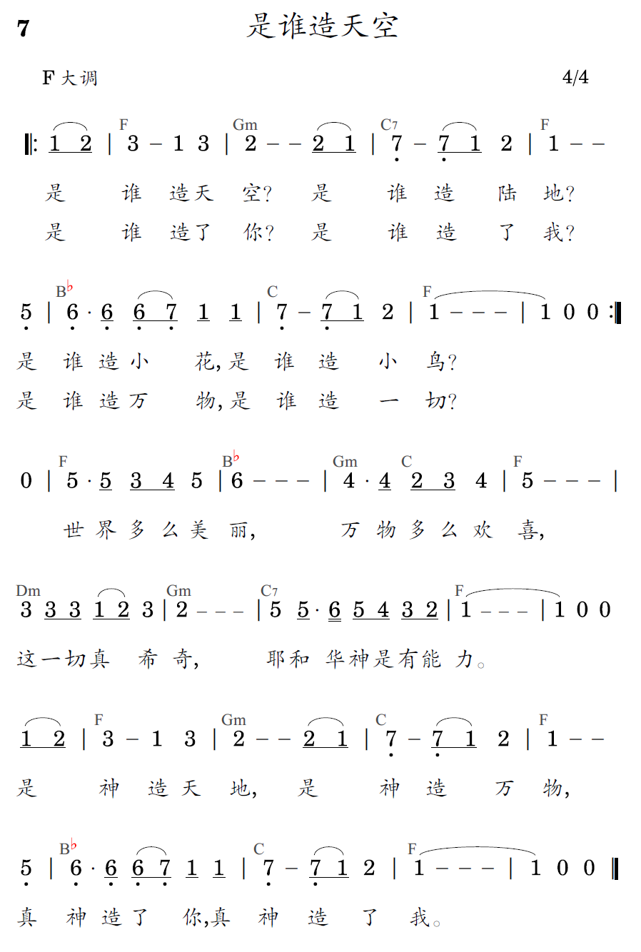 是谁造天空?是谁造陆地?是谁造小花,是谁造小鸟?是谁造了你?是谁造了我?是谁造万物,是谁阅慊切?世界多么美丽,万物多么欢喜,这一切真希奇,耶和华神是有能力。是神造天地,是神造万物,真神造了你,真神造了我。