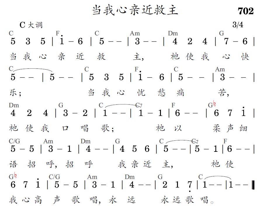 当我心亲近救主,祂使我心快乐;当我心忧愁痛苦,祂使我口唱歌;祂以柔声细语招呼,招呼我亲近主,祂使我心高声歌唱,永远永远歌唱。