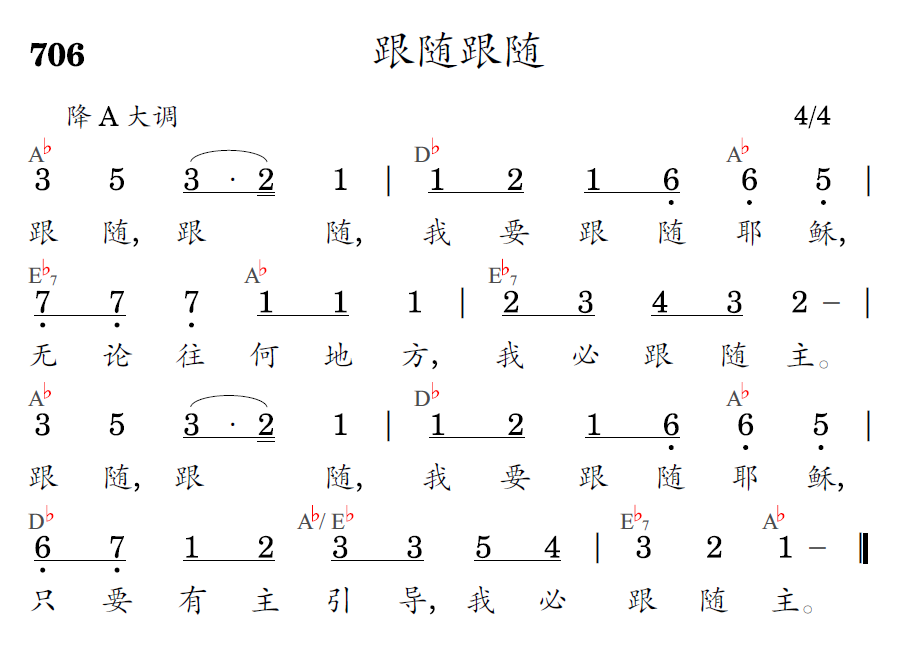 跟随,跟随,我要跟随耶稣,无论往何地方,我必跟随主。跟随,跟随,我要跟随耶稣,只要有主引导,我必跟随主。