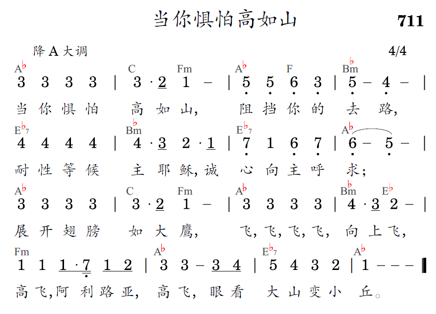 当你惧怕高如山,阻挡你的去路,耐性等候主耶稣,诚心向主呼求;展开翅膀如大鹰,飞,飞,飞,飞,向上飞,高飞,阿利路亚,高飞,眼看大山变小丘。