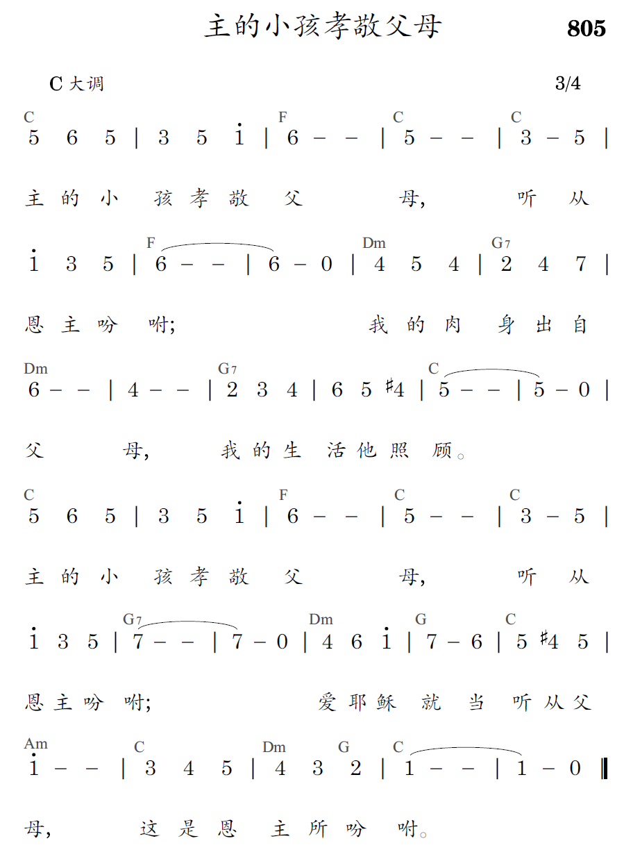 主的小孩孝敬父母,听从恩主吩咐;我的肉身出自父母,我的生活他照顾。主的小孩孝敬父母,听从恩主吩咐;爱耶稣就当听从父母,这是恩主所吩咐。