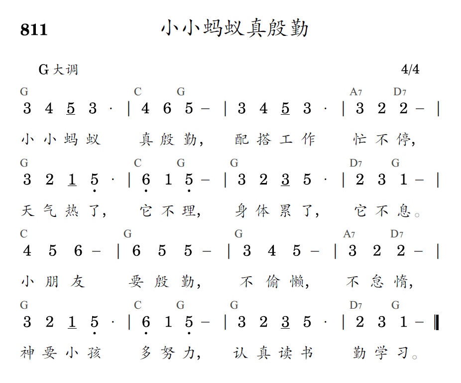 小小蚂蚁真殷勤,配搭工作忙不停,天气热了,它不理,身体累了,它不息。小朋友要殷勤,不偷懒,不怠惰,神要小孩多努力,认真读书勤学习。