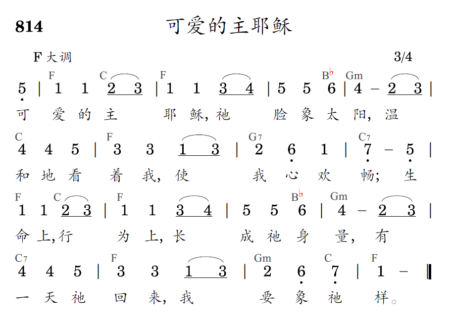 可爱的主耶稣,祂脸像太阳,温和的看着我,使我心欢畅;生命上,行为上,长成祂身量,有一天祂回来,我要像祂样。