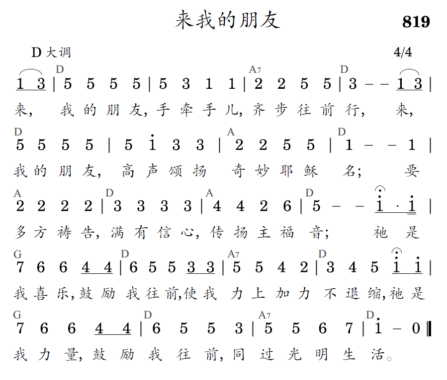 来,我的朋友,手牵手儿,齐步往前行,来,我的朋友,高声颂扬奇妙耶稣名;要多方祷告,满有信心,传扬主福音;祂是我喜乐,鼓励我往前,使我力上加力不退缩,祂是我力量,鼓励我往前,同过光明生活。