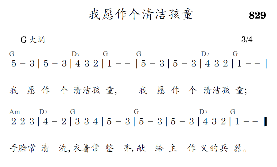 我愿作个清洁孩童,我愿作个清洁孩童;手脸常清洗,衣着常整齐,献给主作义的兵器。