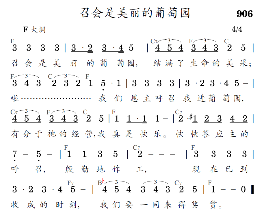 召会是美丽的葡萄园,结满了生命的美果;啦……………我们恩主呼召我进葡萄园,有分于祂的经营,我真是快乐。快快答应主的呼召,殷勤的作工,现在已到收成的时刻,我们要一同来得奖赏。