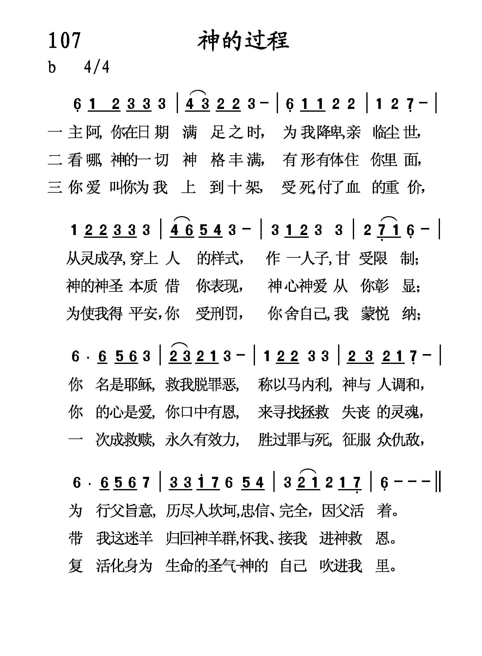 主啊,你在日期满足之时,为我降卑,亲临尘世,从灵成孕,穿上人的样式,作一人子,甘受限制;你名是耶稣,救我脱罪恶,称以马内利,神与人调和,为行你旨意,历尽人坎坷,忠信、完全,因父活着。