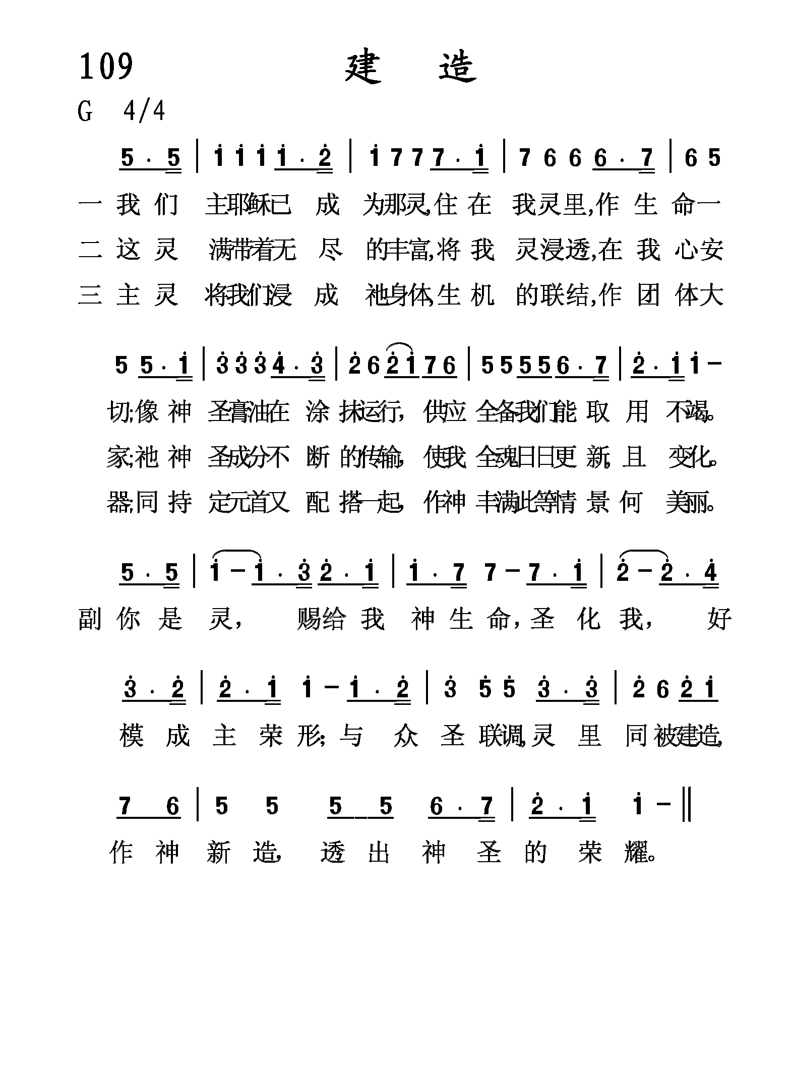 你是灵,赐给我神生命,圣化我,好模成主荣形;与众圣联调,灵里同被建造,作神新造,透出神圣的荣耀。