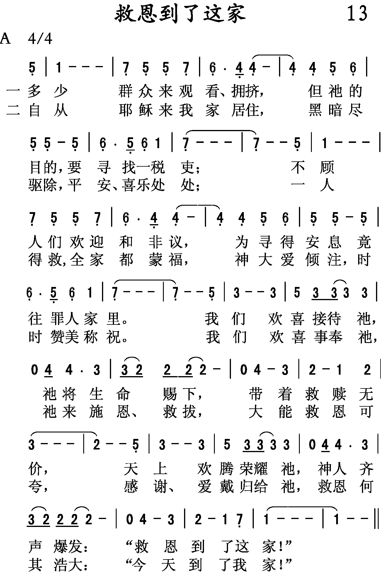 多少群众来观看,拥挤,但祂的目的,要寻找一税吏;不顾人们欢迎和非议,为寻得安息,竟往罪人家里。我们欢喜接待祂,祂将生命赐下,带着救赎无价,天上欢腾荣耀祂,神,人齐声爆发:“救恩到了这家!“