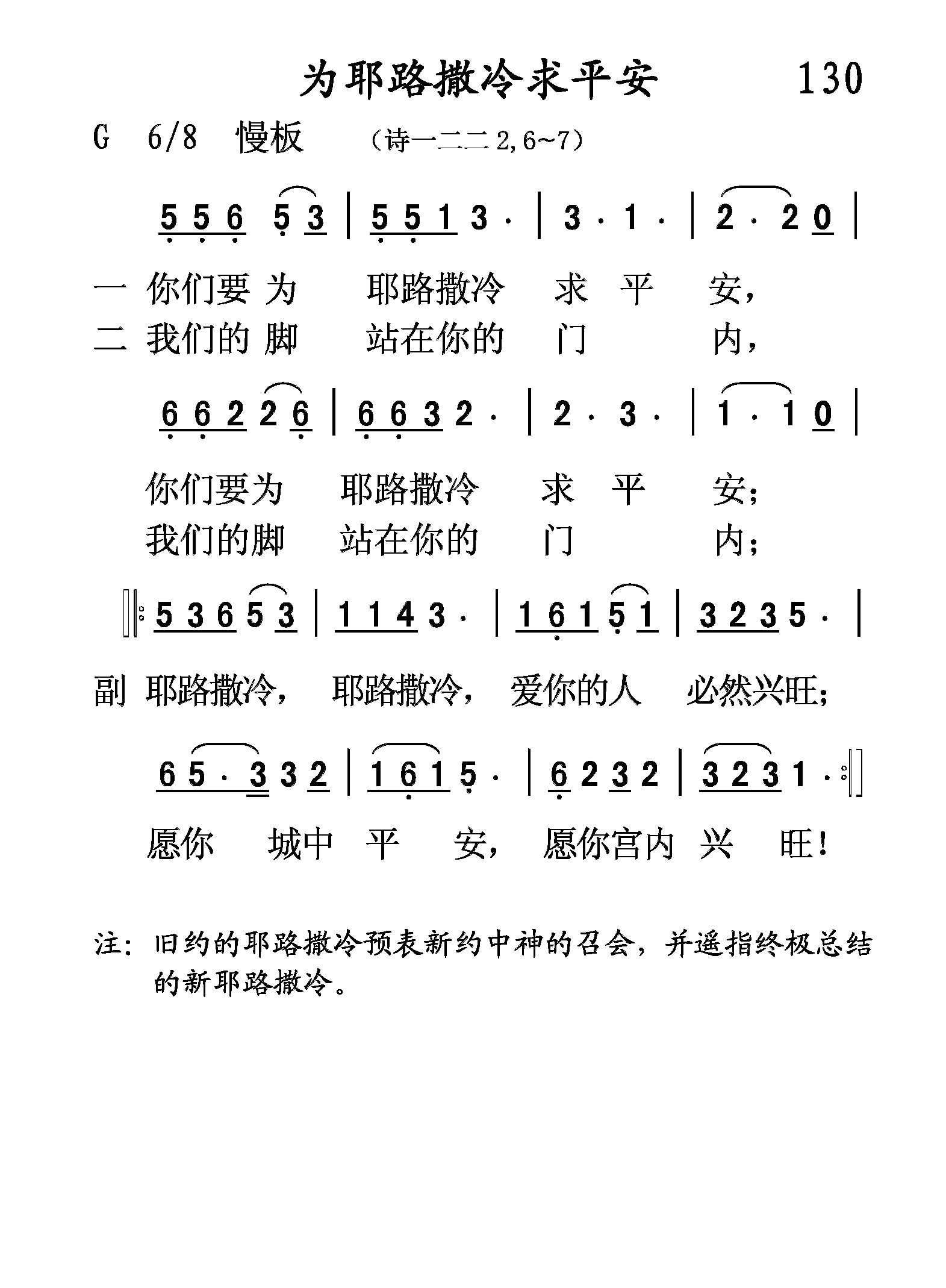 我们的脚站在你的门内,我们的脚站你的门内;耶路撒冷,耶路撒冷,爱你的人必然兴旺;愿你城中平安,愿你宫内兴旺!