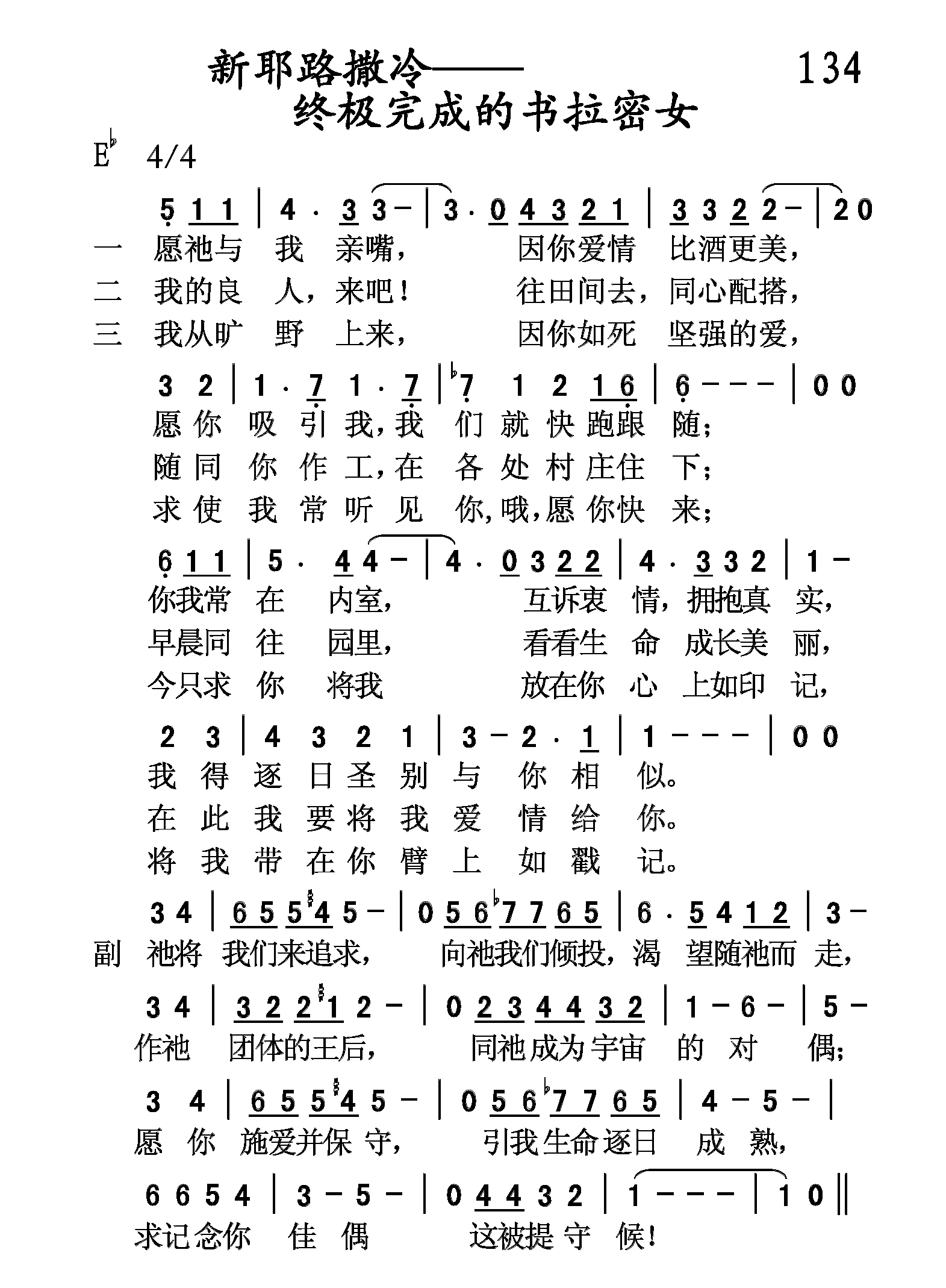 愿他与我新嘴,因你爱情比酒更美,愿你吸引我,我们就快跑跟随;你我常在内室,互诉衷情,拥抱真实,我得逐日圣别与你相似。