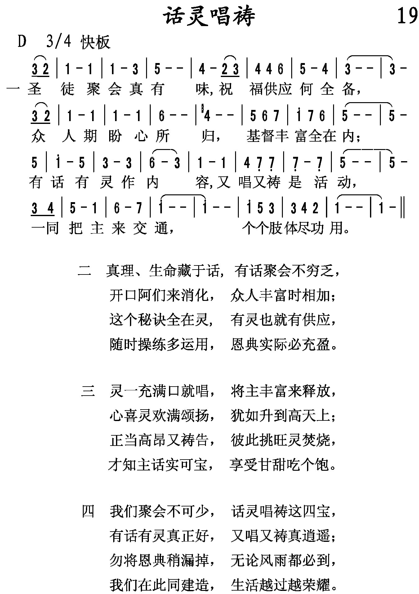 我们聚会不可少,话灵唱祷这四宝,有话有灵真正好,又唱又祷真逍遥;勿将恩典稍漏掉,无论风雨都必到,我们在此同建造,生活越来越荣耀。