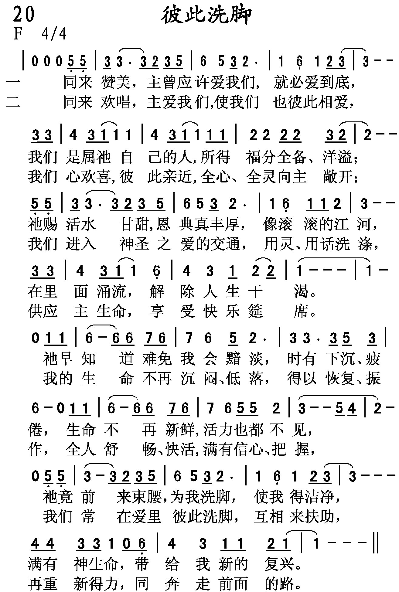 同来欢唱,主爱我们,使我们也彼此相爱,我们心欢喜,彼此接近,全心,全灵向主敞开;我们进入神圣之爱的交通,用灵,用话洗涤,供应主生命,享受快乐筵席。我的生命不再沉闷,低落,得以恢复,振作,全人舒畅,快活,满有信心,把握,我们常在爱里彼此洗脚,互相来扶助,再重新得力,同奔走前面的路。