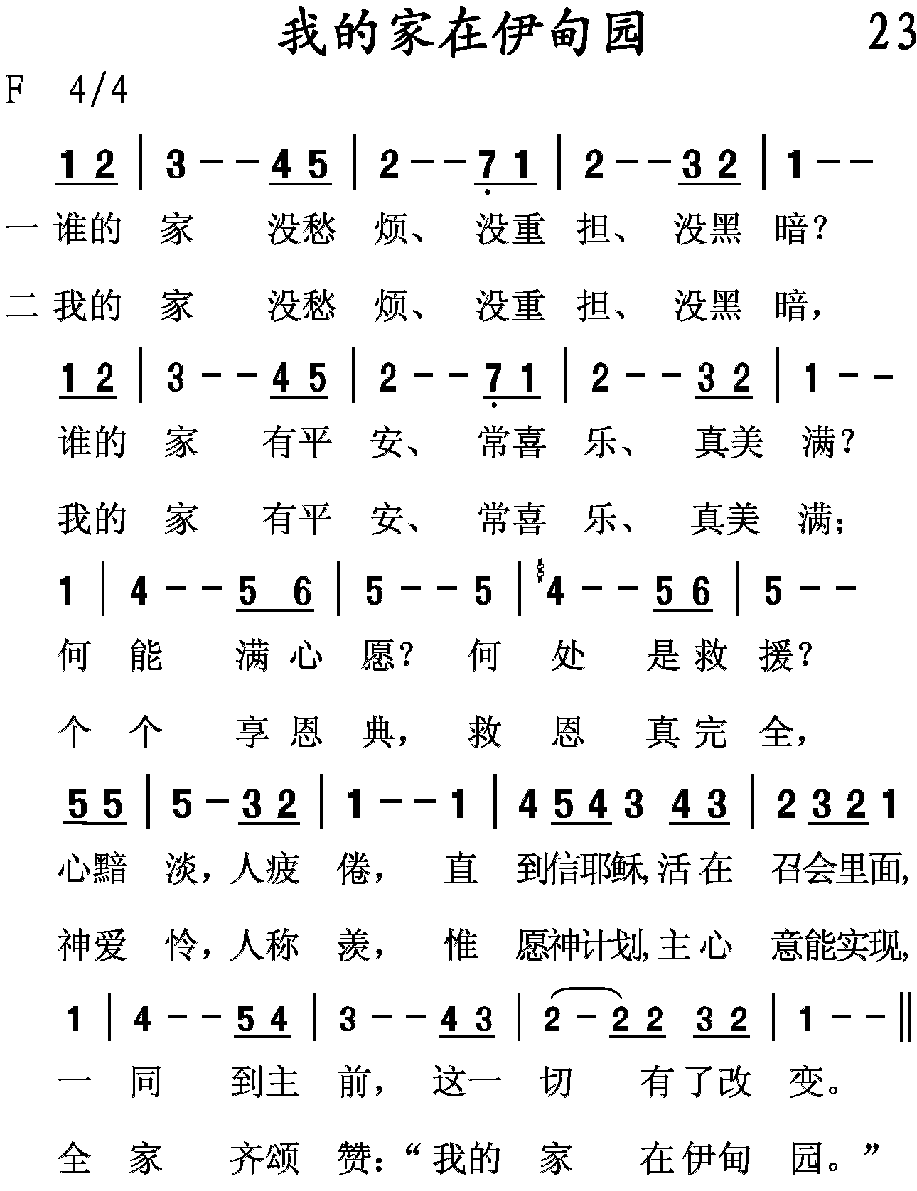 我的家没愁烦,没重担,没黑暗,我的家有平安,常喜乐,真美满;个个享恩典,救恩真完全,神爱怜,人称羡,惟愿神计划,主心意能实现,全家齐颂赞:“我的家在伊甸园。“