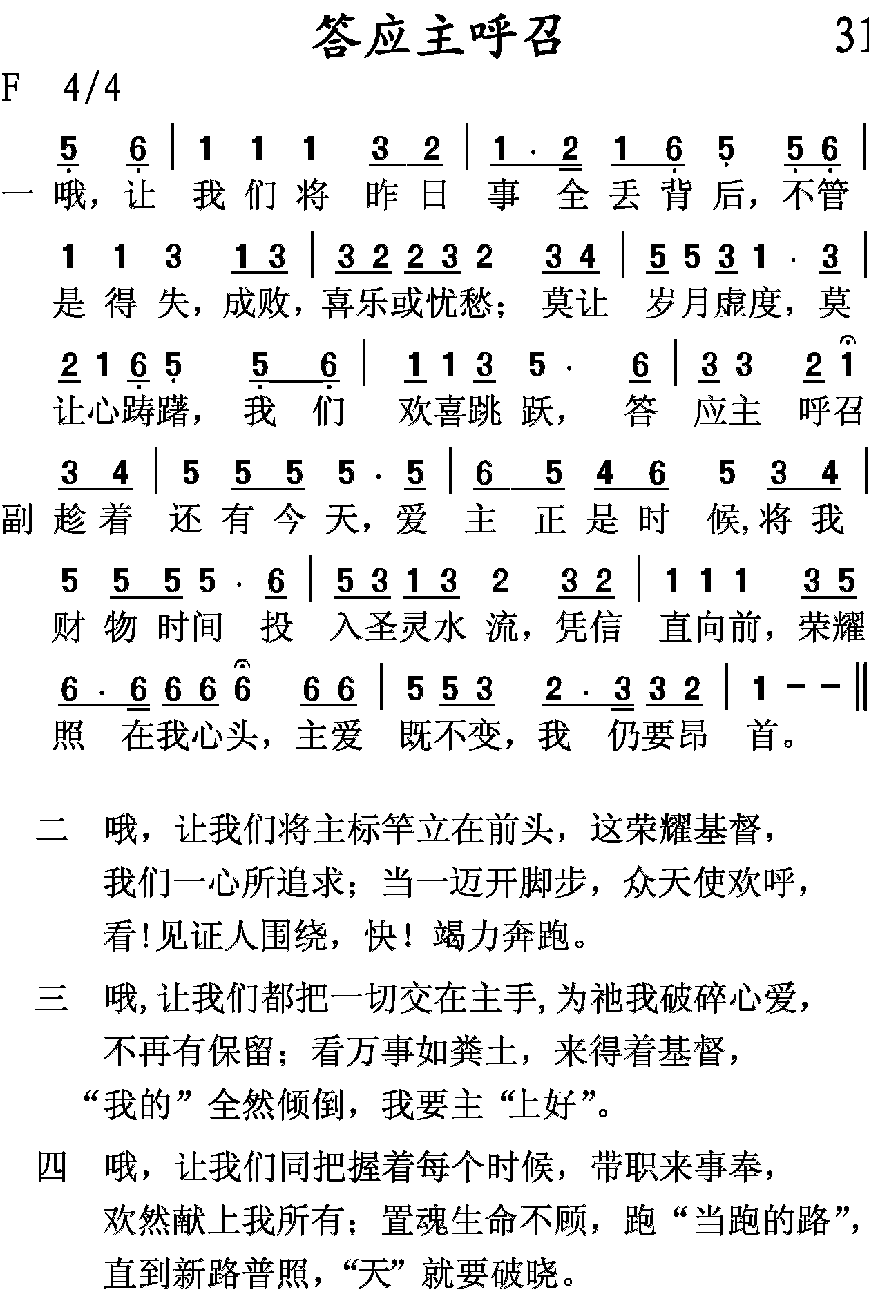 哦,让我们将昨日事全丢背后,不管是得失,成败,喜乐或忧愁;莫让岁月虚度,莫让心踌躇,我们欢喜跳跃,答应主呼召。