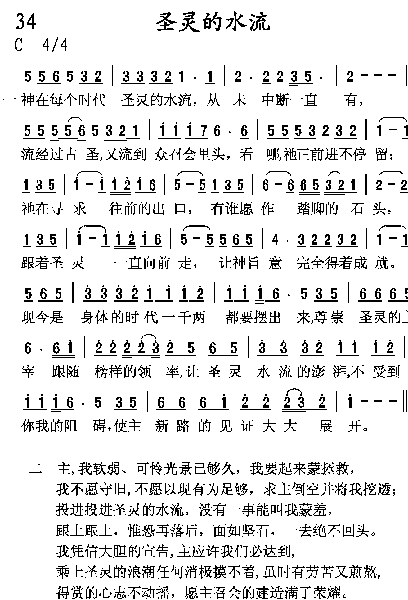 主,我软弱,可怜光景已够久,我要起来蒙拯救,我不愿守旧,不愿以现有为足够,求主倒空并将我挖透;投进投进圣灵的水流,没有一事能叫我蒙羞,跟上跟上,惟恐再落后,面如坚石,一去绝不回头。我凭信大胆的宣告,主应许我们必达到,乘上圣灵的浪潮任何消极摸不着,虽时有劳苦又煎熬,得赏的心志不动摇,愿主召会的建造满了荣耀