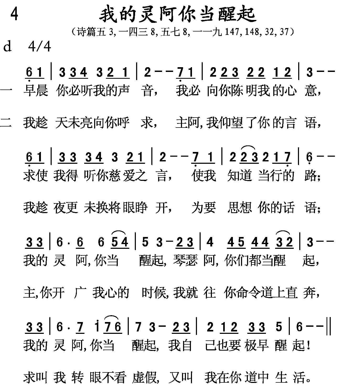 早晨你必听我的声音,我必向你陈明我的心意,求使我得听你慈爱之言,使我知道当行的路;我的灵啊,你当醒起,琴瑟啊,你们都当醒起,我的灵啊,你当醒起,我自己要极早醒起。