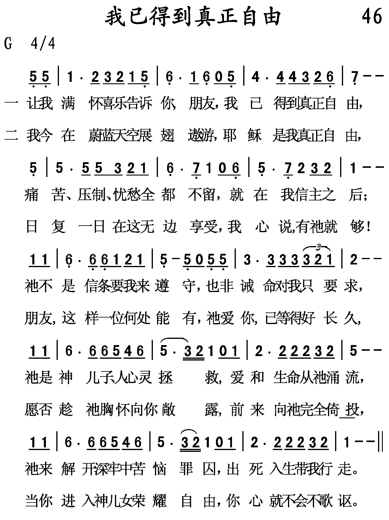 让我满怀喜乐告诉你,朋友,我已得到真正自由,痛苦,压制,忧愁全都不留,就在我信主之后;祂不是信条要我来遵守,也非诫命对我只要求,祂是神儿子,人心灵拯救,爱和生命众祂涌流,祂来解天深牢中苦恼罪囚,出死入生带我行走。