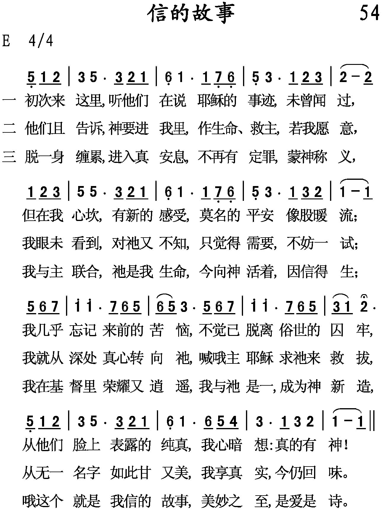 初次来这里,听他们在说耶稣的事迹,未曾闻过,但在我心坎,有新的感受,莫名的平安像股暖流;我几乎忘记往日的苦恼,不知已脱离罪恶的囚牢,从他们脸上表露的纯真,我心暗想:真的有神!