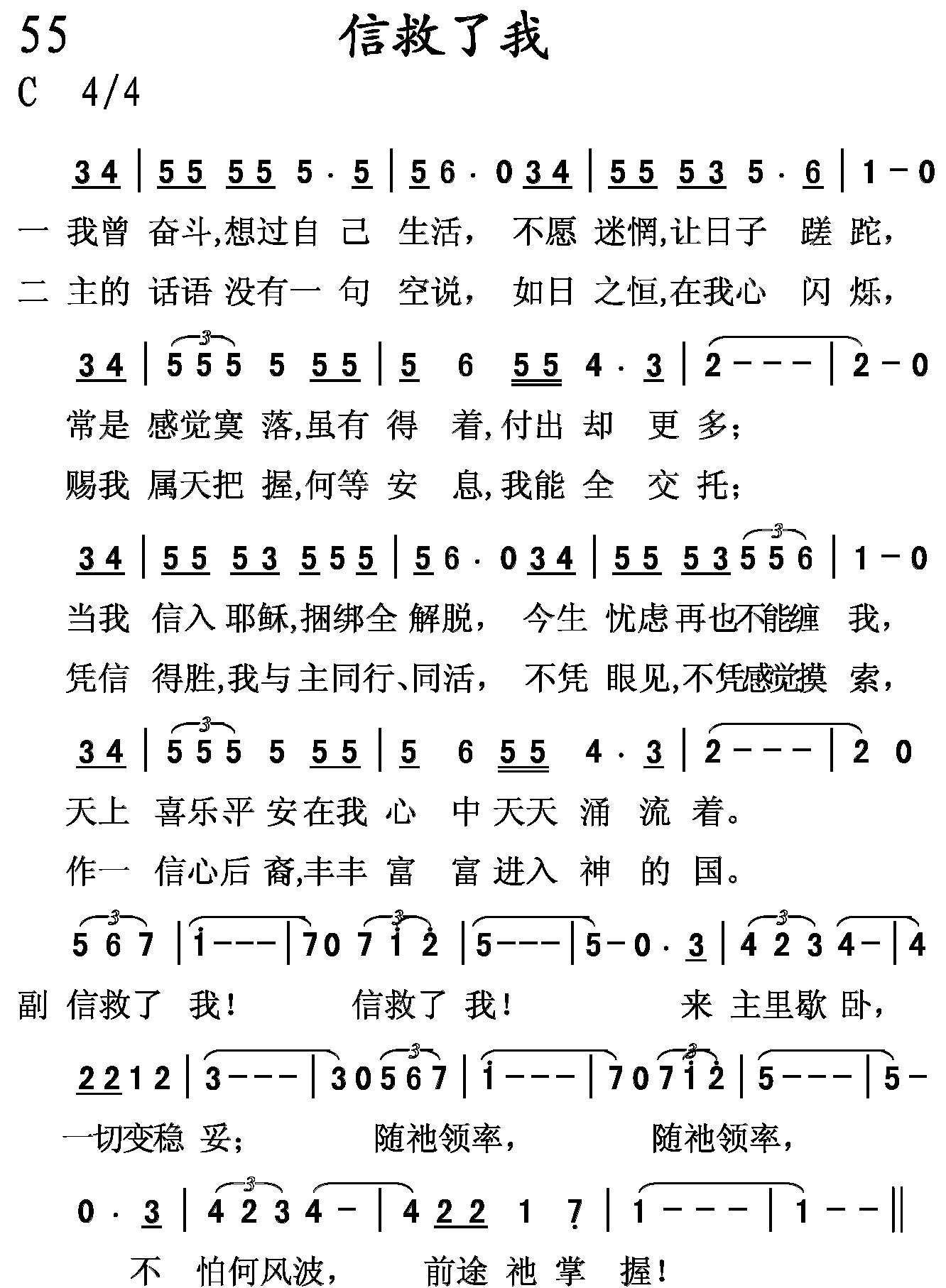 信救了我!信救了我!来主里歇卧,一切变稳妥;随祂领率,随祂领率,不怕何风波,前途祂掌握!