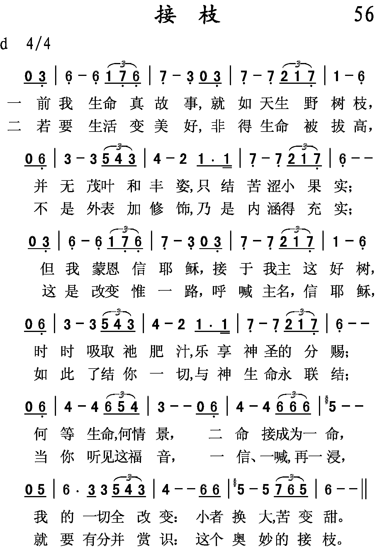 前我生命真故事,如天生野树枝,并无茂叶和丰姿,只结苦涩小果实;但我蒙恩信耶稣,接于我主这好树,时时吸取祂肥汁,乐享神圣的分赐;何等生命,何情景,二命接成为一命,我的一切全改变:小者换大,苦变甜。
