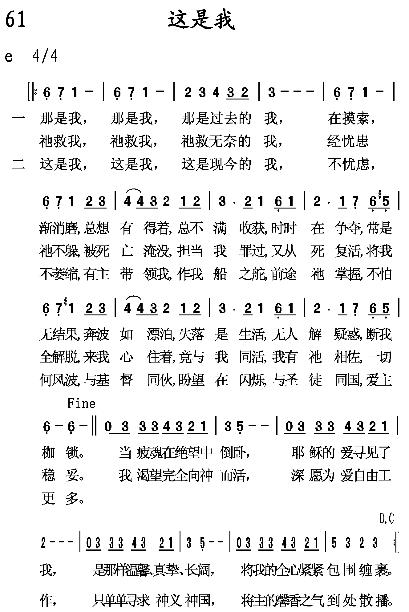 这是我,这是我,这是现今的我,不忧虑,不萎缩,有主带领我,作我船之舵,前途祂掌握,不怕何风波,与基督同伙,盼望在闪烁,与圣徒同国,爱主更多。