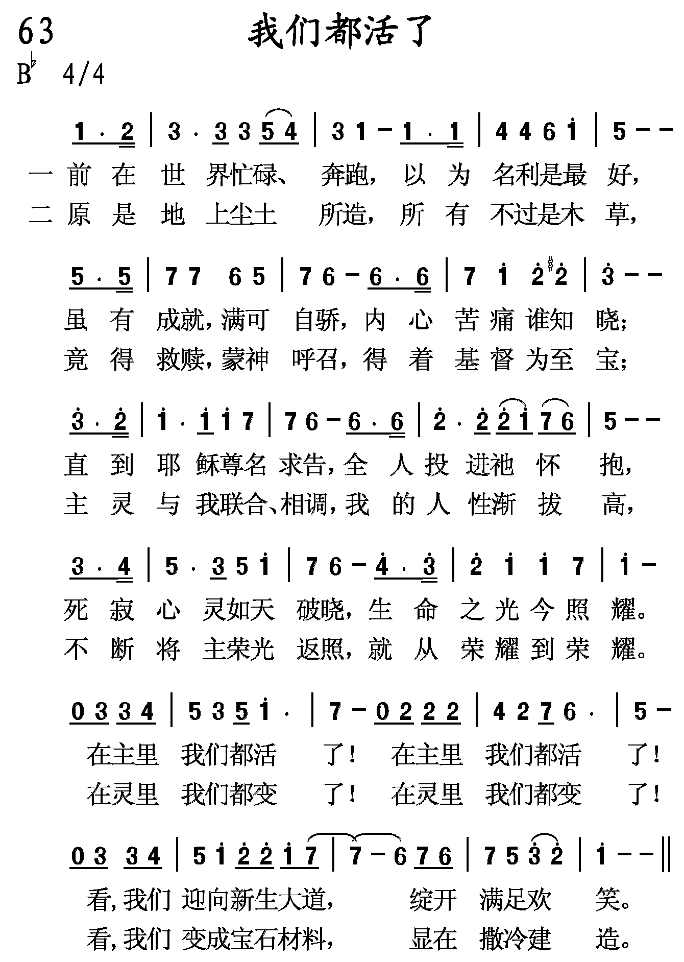 前在世界忙碌、奔跑,以为名利是最好,虽有成就,满可自骄,内心苦痛谁知晓;直到耶稣尊名求告,全人投进祂怀抱,死寂心灵如天破晓,生命之光今照耀。在主里我们都活了!在主里我们都活了!看,我们迎向新生大道,绽开满足欢笑。