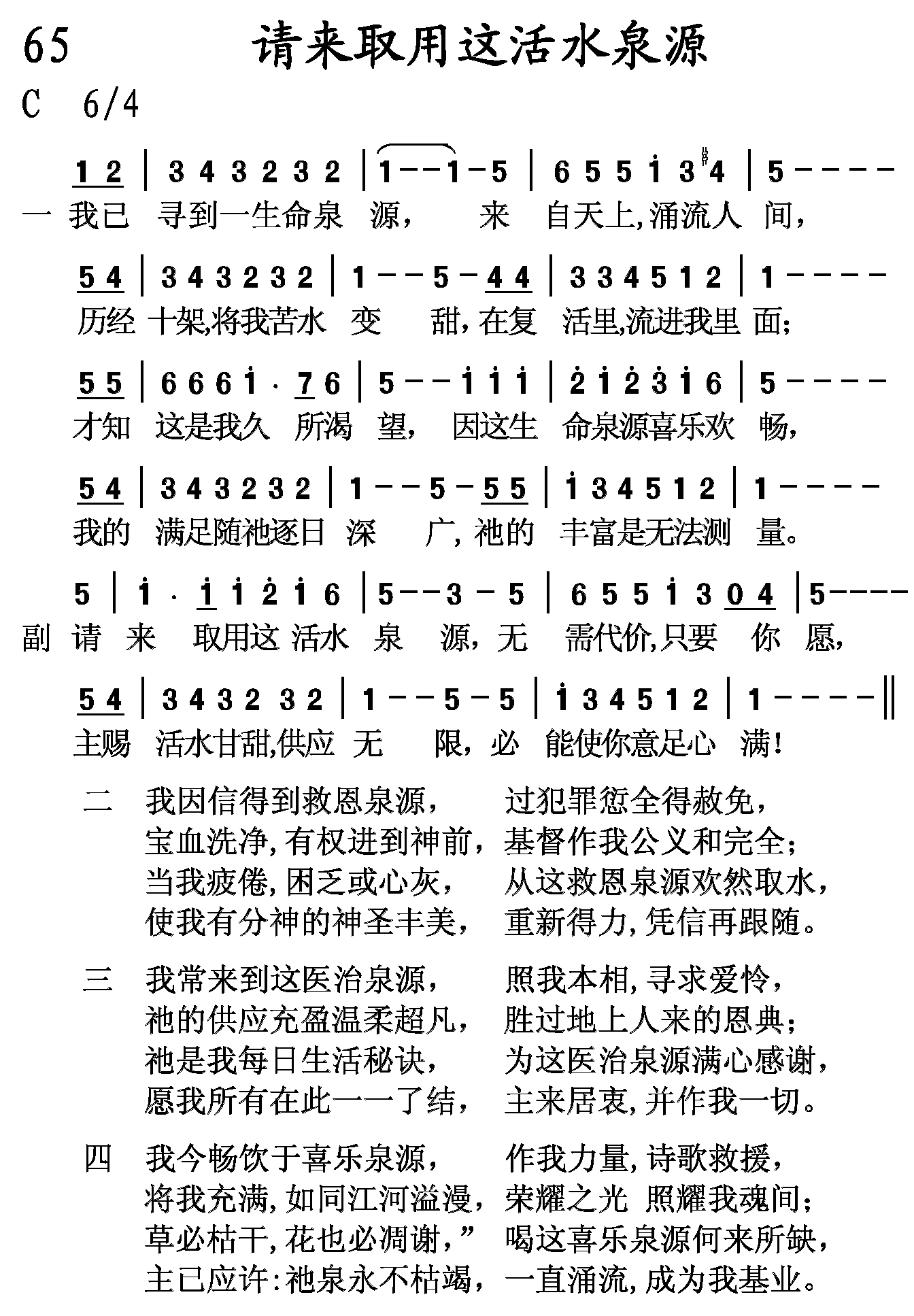 请来取用这活水泉源,无须代价,只要你愿,主赐活水甘甜,供应无限,必能使你意足心满!