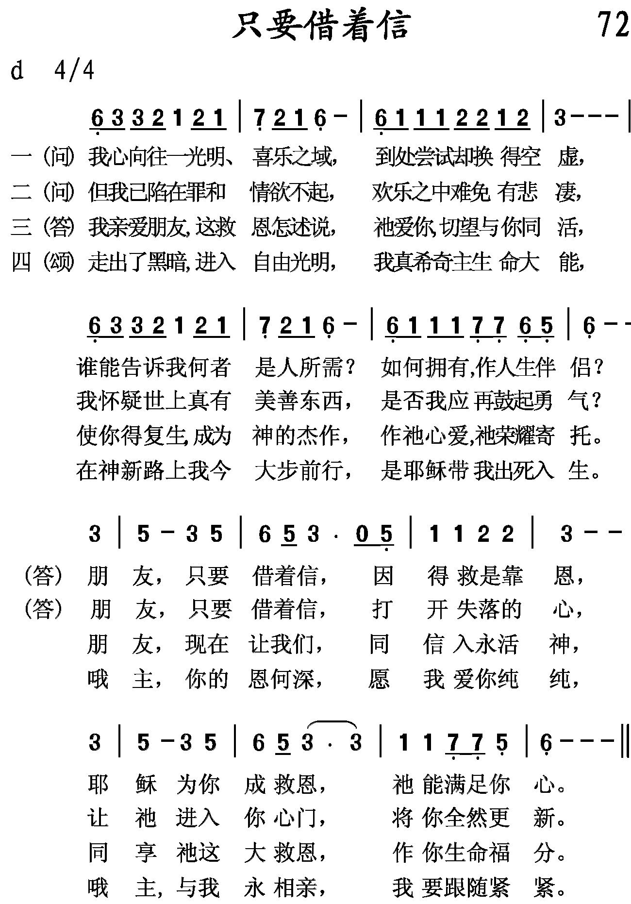 (问):我心向往一光明、喜乐之域,到处尝试却换得空虚,谁能告诉我何者是人所需?如何拥有,作人生伴侣?(答):朋友,只要借着信,因得救是靠恩,耶稣为你成救恩,祂能满足你心。