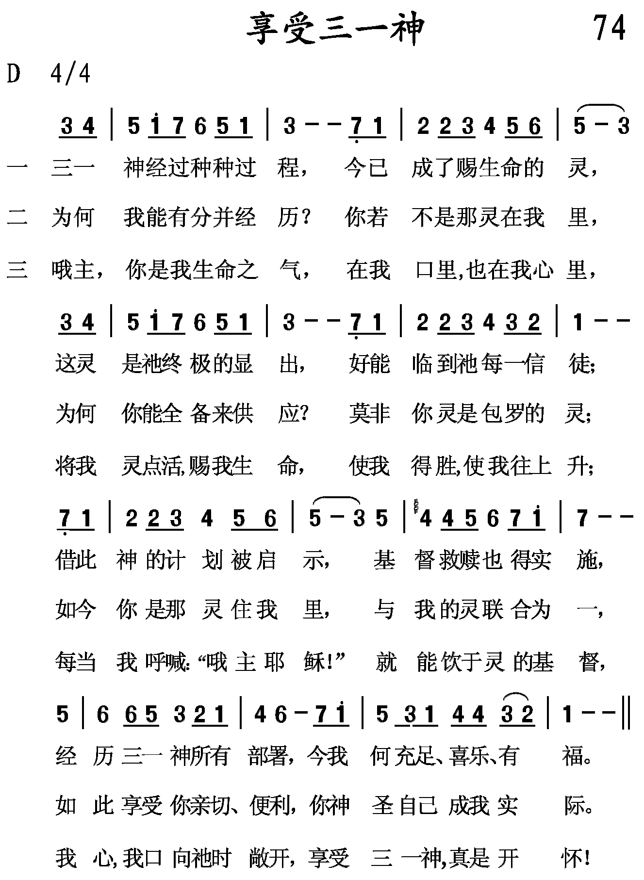 哦主,你是我生命之气,在我口里,也在我心里,将我灵点活,赐我生命,使我得胜,使我往上升;每当我呼喊:“哦主耶稣!”就能饮于灵的基督,我心,我口向祂时敞开,享受三一神,真是开怀!